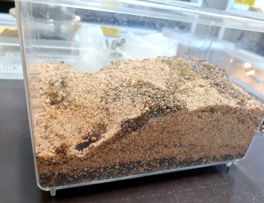 店頭ではプラケースに1㎝ほど湿らせたバーミキュライトを敷き、その上に砂を6分目くらいまで入れています。