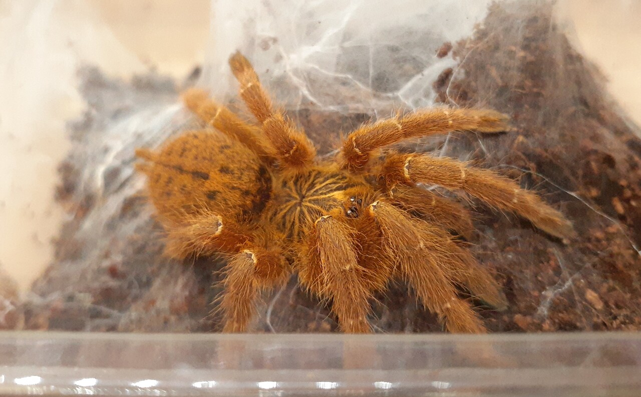 名前の通り、体がでかくて脚に金色のストライプが入るタランチュラ!