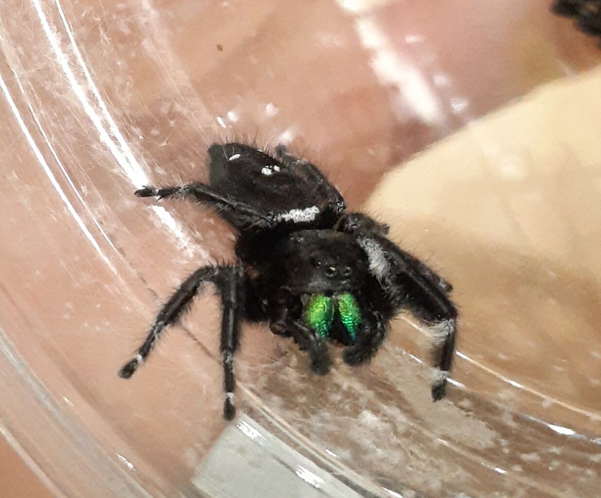 鮮やかなエメラルドグリーンの鋏角をしたハエトリグモ!