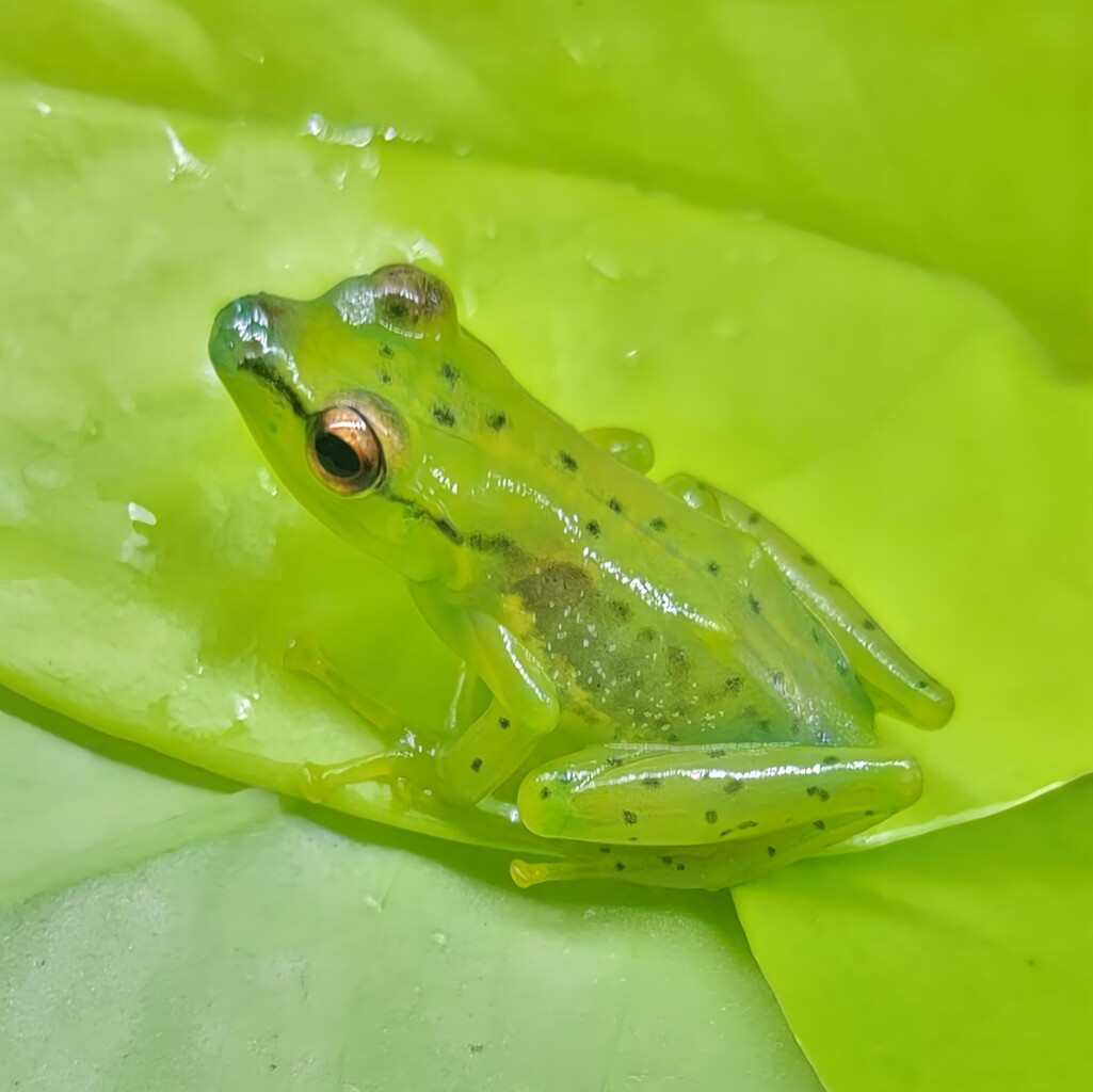 透明感のある黄緑色の体色に尖った鼻と大きな顔、体側に入る線や斑点が特徴な半樹上棲カエル