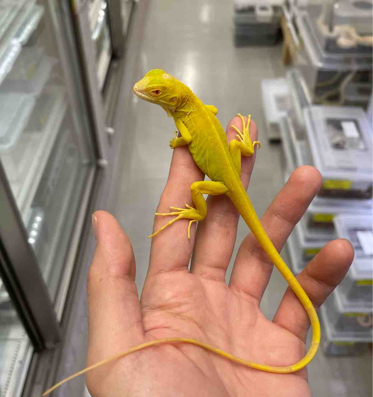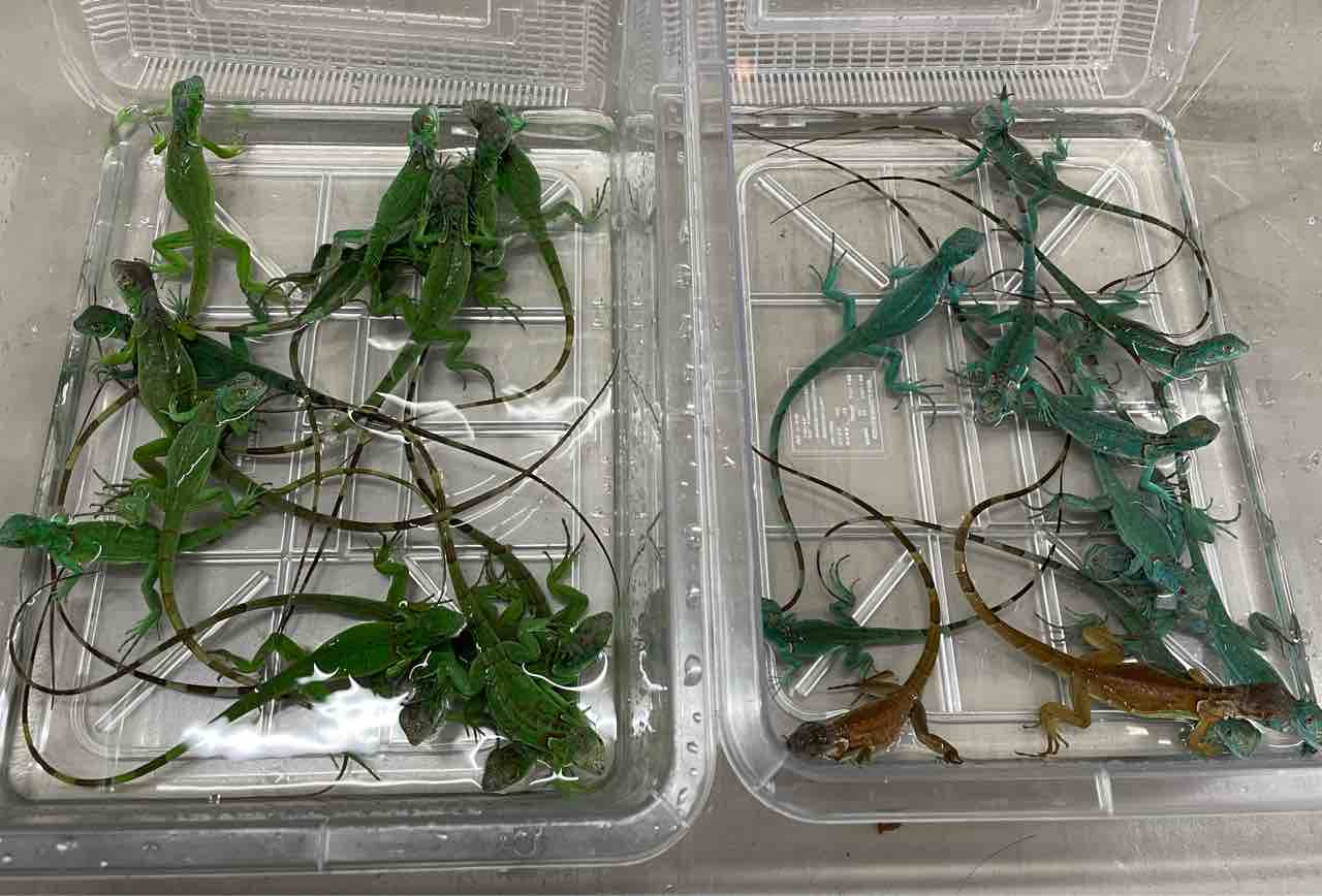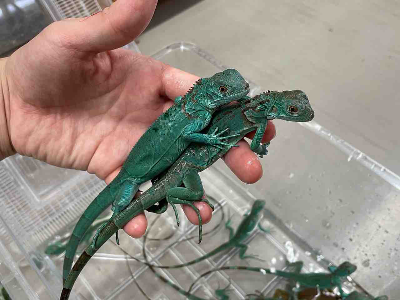 少し前に入荷していたパープル・ライム・トランスと併せて紹介してますが、今回入荷の赤青緑アルビノと併せてベビーのイグアナ達がとんでもない量入荷してます。