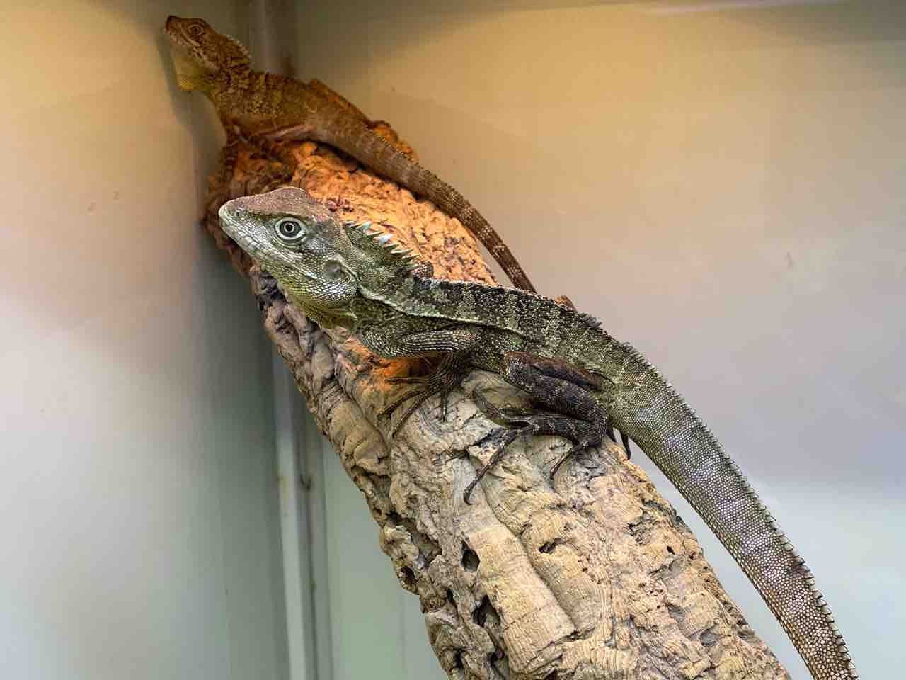 ・細い枝ではなくトカゲの肩幅より太めのコルクや流木でケージ上部に設置した光源に近付けるようにレイアウト。