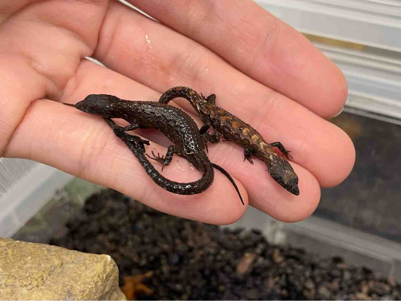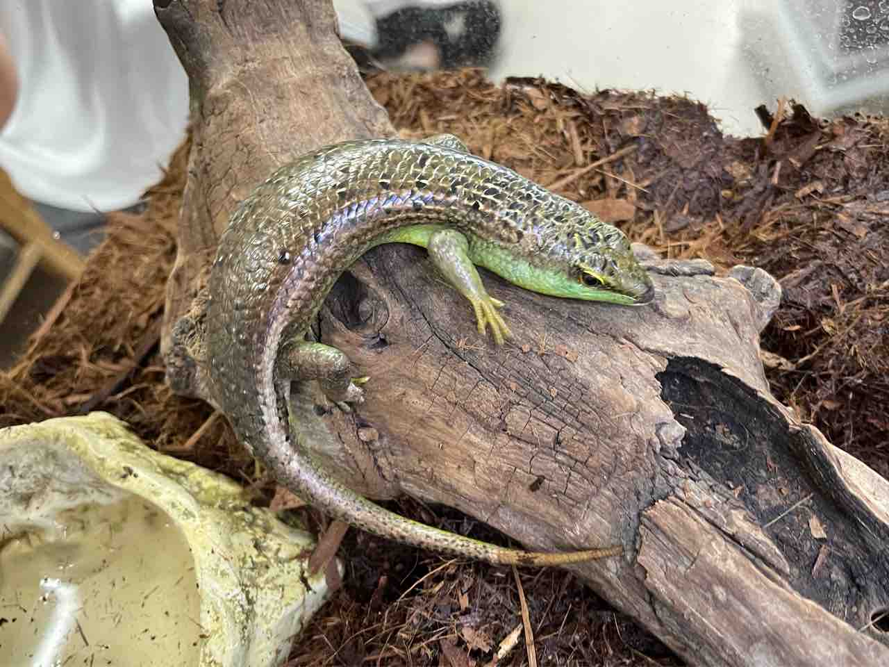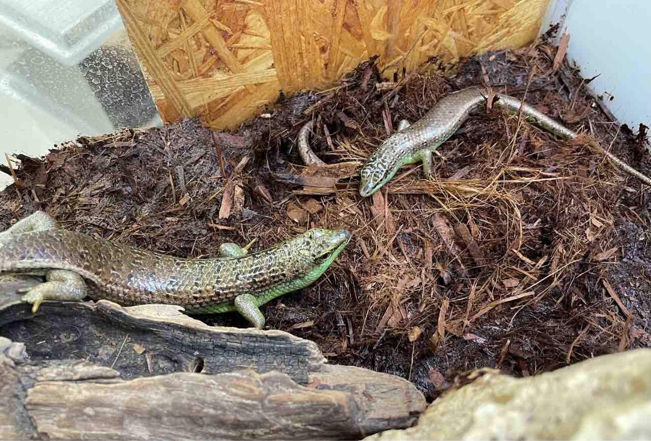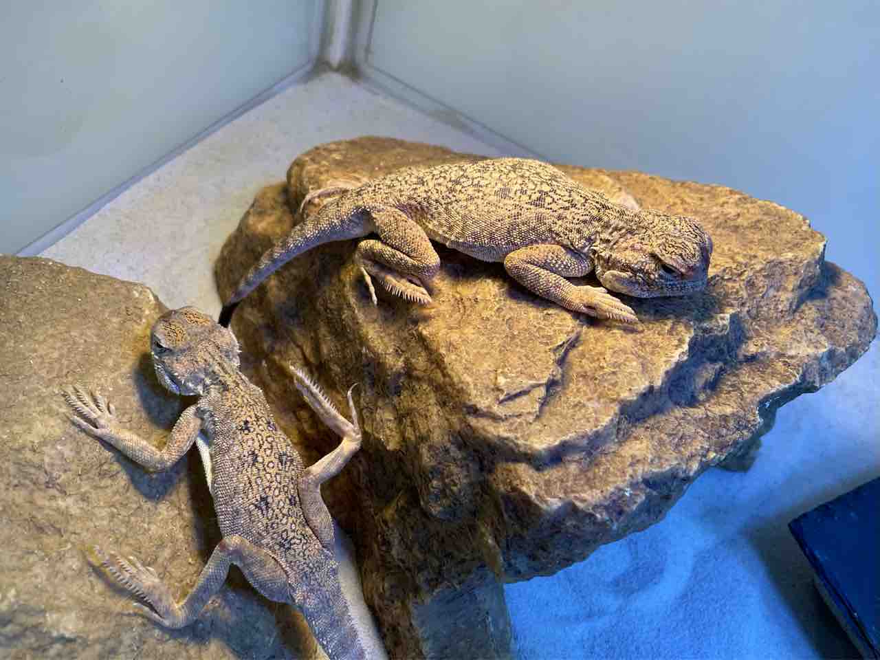 飼育は一般的な昼行性トカゲのそれで良いのですが正の趨触性(なにかに身体が触れていると落ち着きやすい)が顕著なのでシェルターや石やコルクなどを用意しましょう。大抵どっかに挟まって落ち着きます。