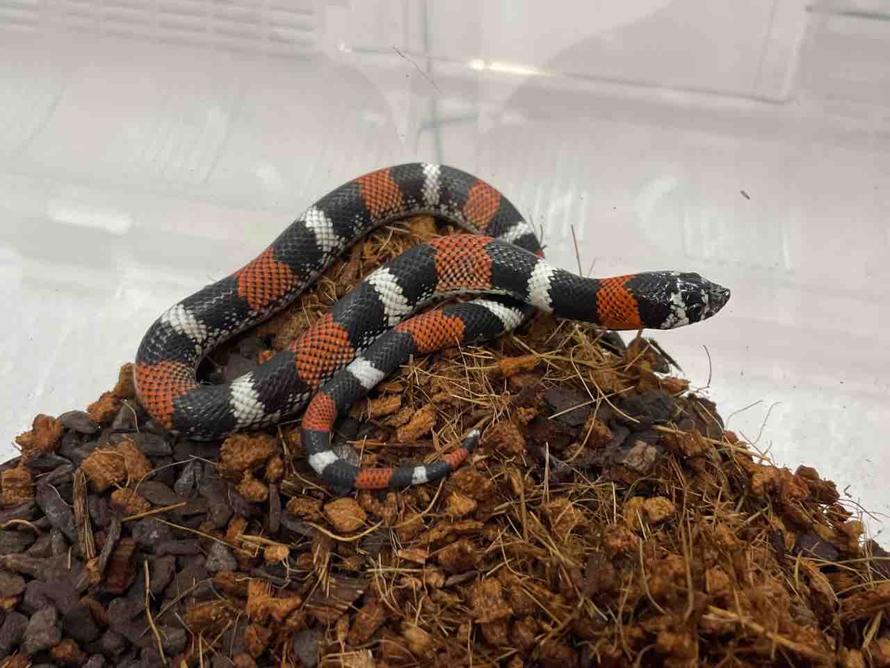 この赤・黒・白の配色はミルクスネークなどと同じくサンゴヘビMicrurus への擬態と考えられています。