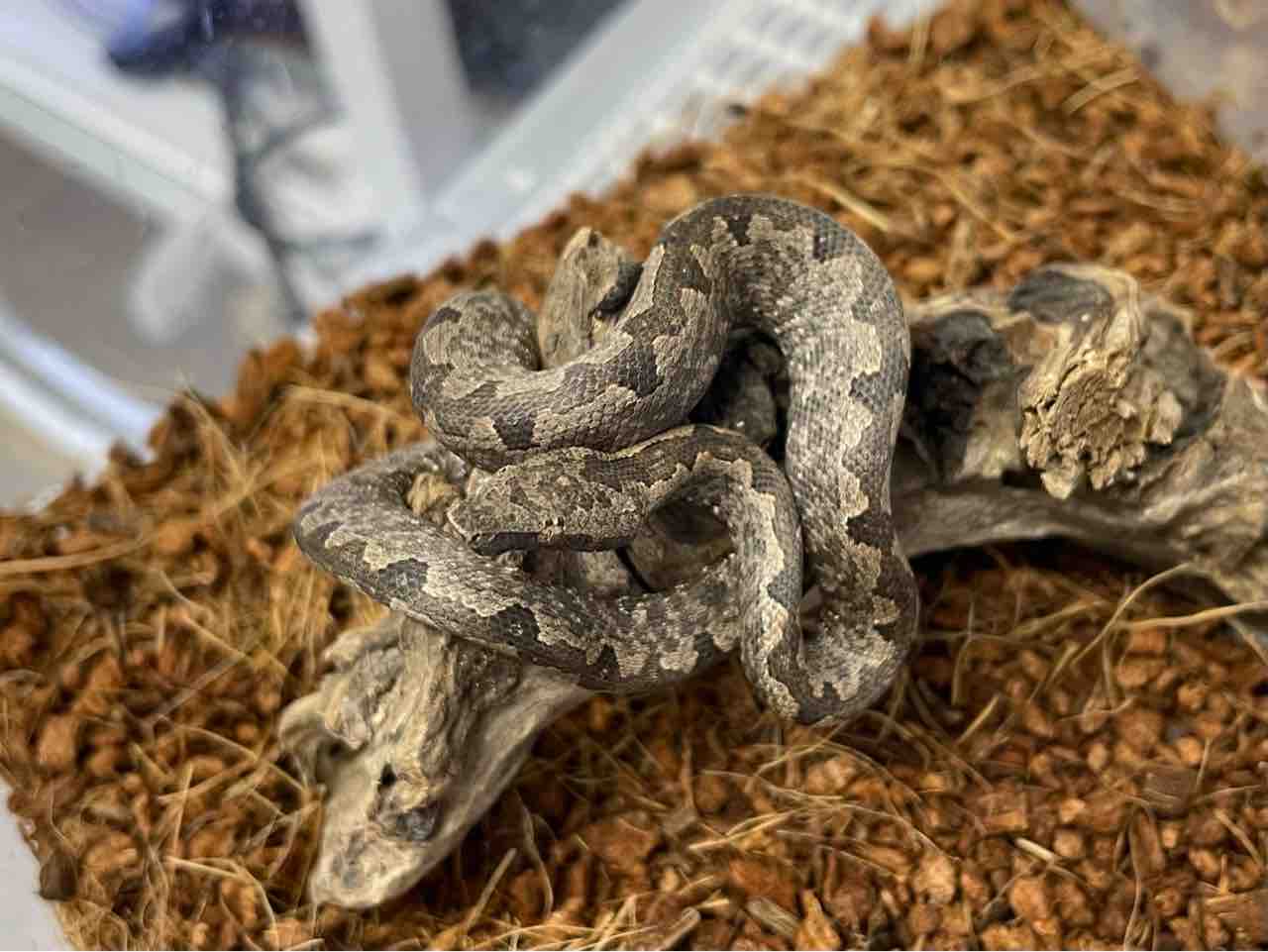 木登りは大得意ですが同属のエメラルドツリーボアC.caninus のように一本枝にコイルを巻いて鎮座することはあまり得意ではないので、少し太めの枝を複数本交差させてもたれかからせるようにしてやると良いです。