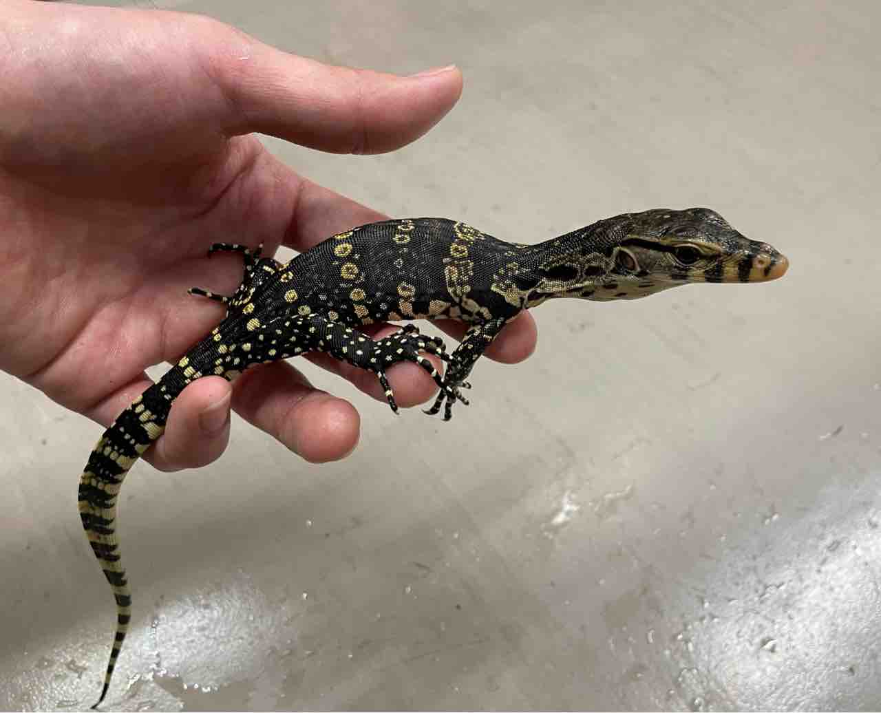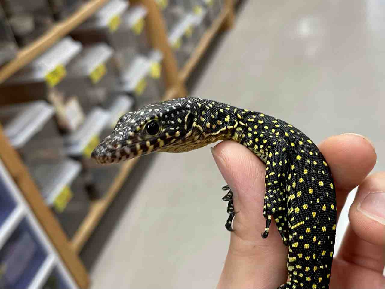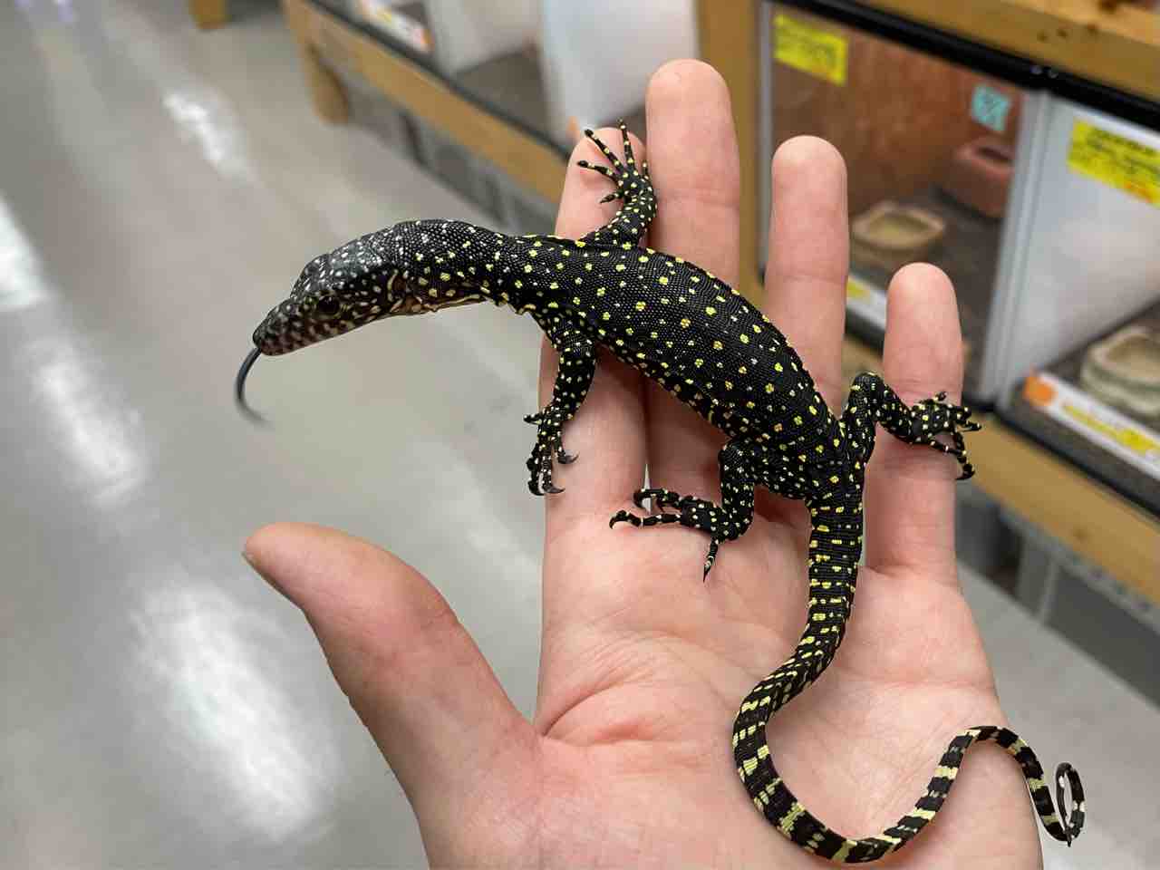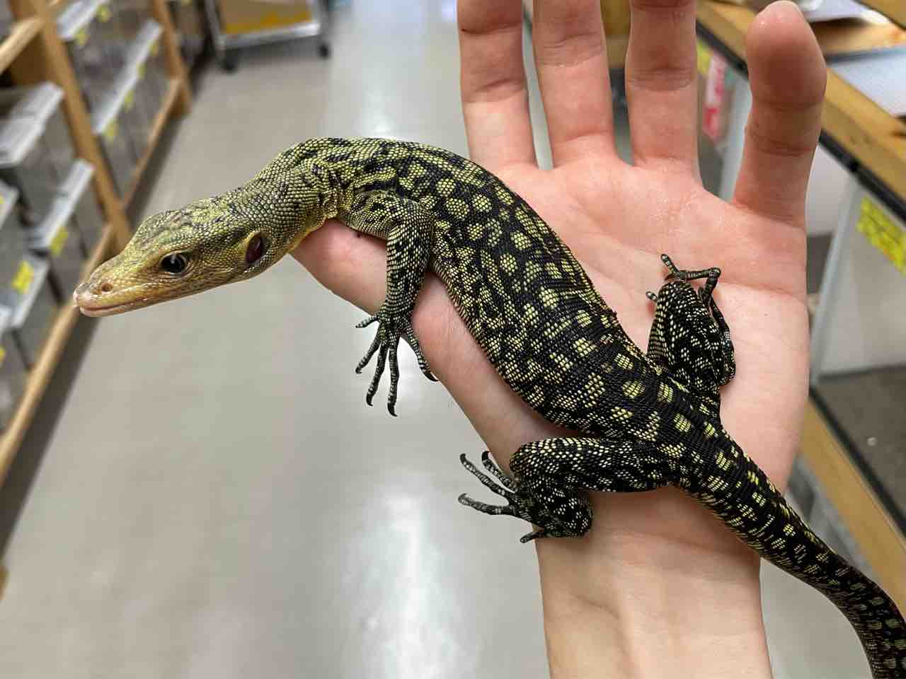 インドネシアのスラ諸島に棲息する、黒と黄色の対比が美しいオオトカゲ。又の名をコガネオオトカゲ。