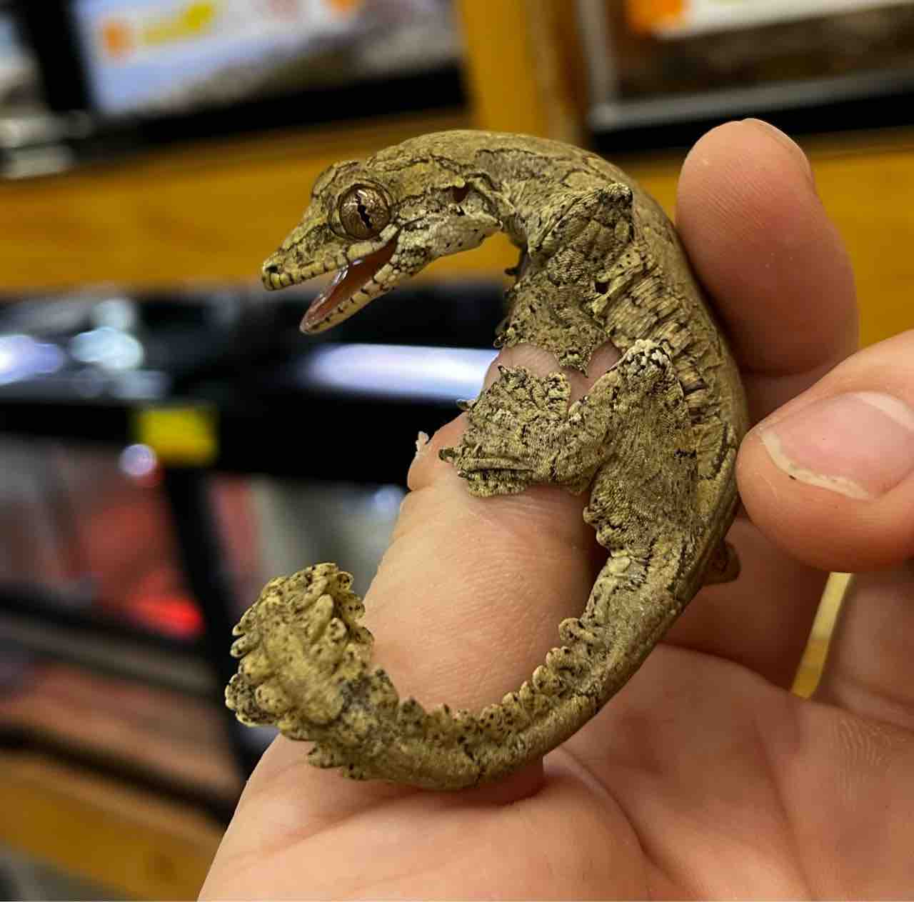 オマキホソユビヤモリの和名の通り尻尾がゼンマイのようにくるっと巻きます。