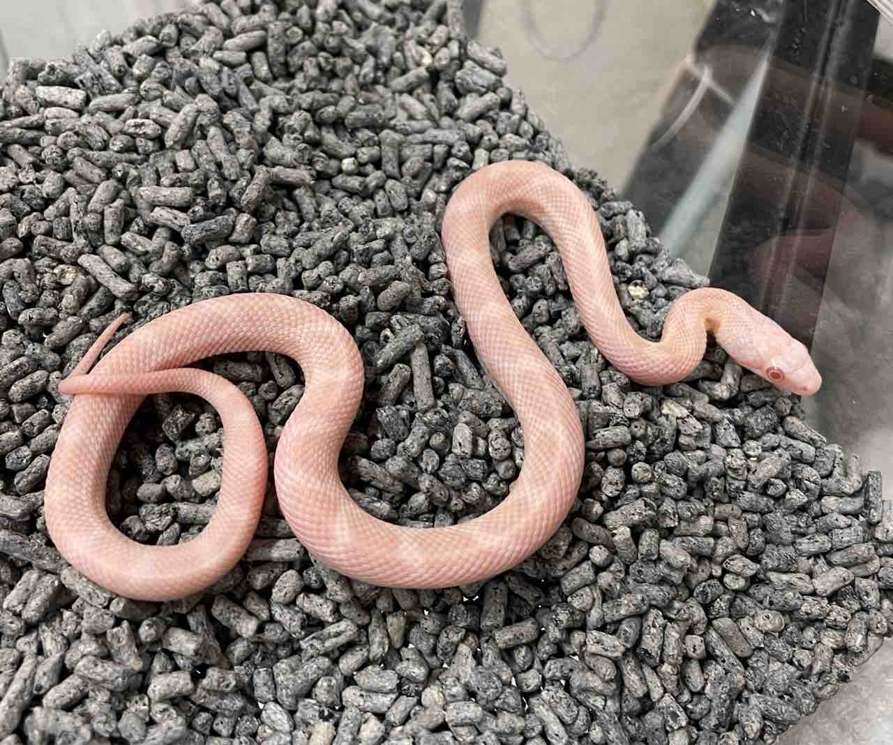 元々は黒っぽい色合いのブラックラットスネーク。それをアルビノ化すると前述の黄色っぽいアオダイショウとは異なりなんと可愛らしいピンク色に。