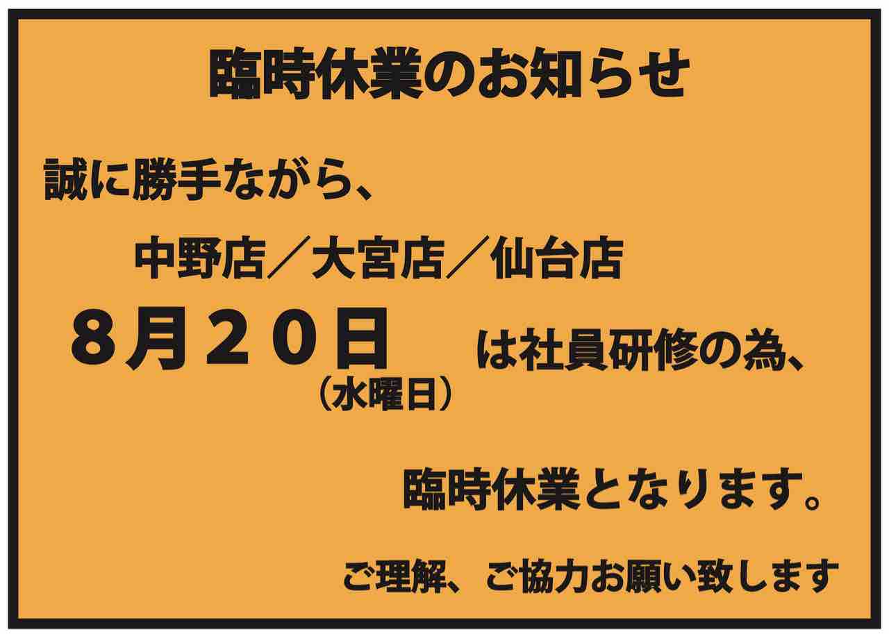 臨時休業のお知らせです。上記画像の通り、爬虫類倶楽部中野、大宮、仙台店は8月20日(水)に社員研修の為に臨時休業をいただきます。翌日21日(木)も定休日なのでお間違えのないようにお願いいたします。営業再開は8月22日(金)からになります。ご迷惑をおかけしますが、ご理解ご協力をお願いいたします。