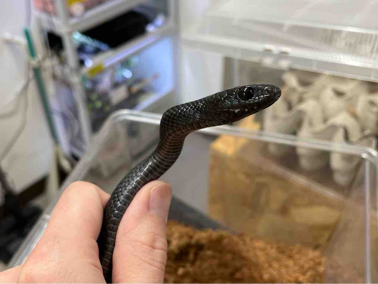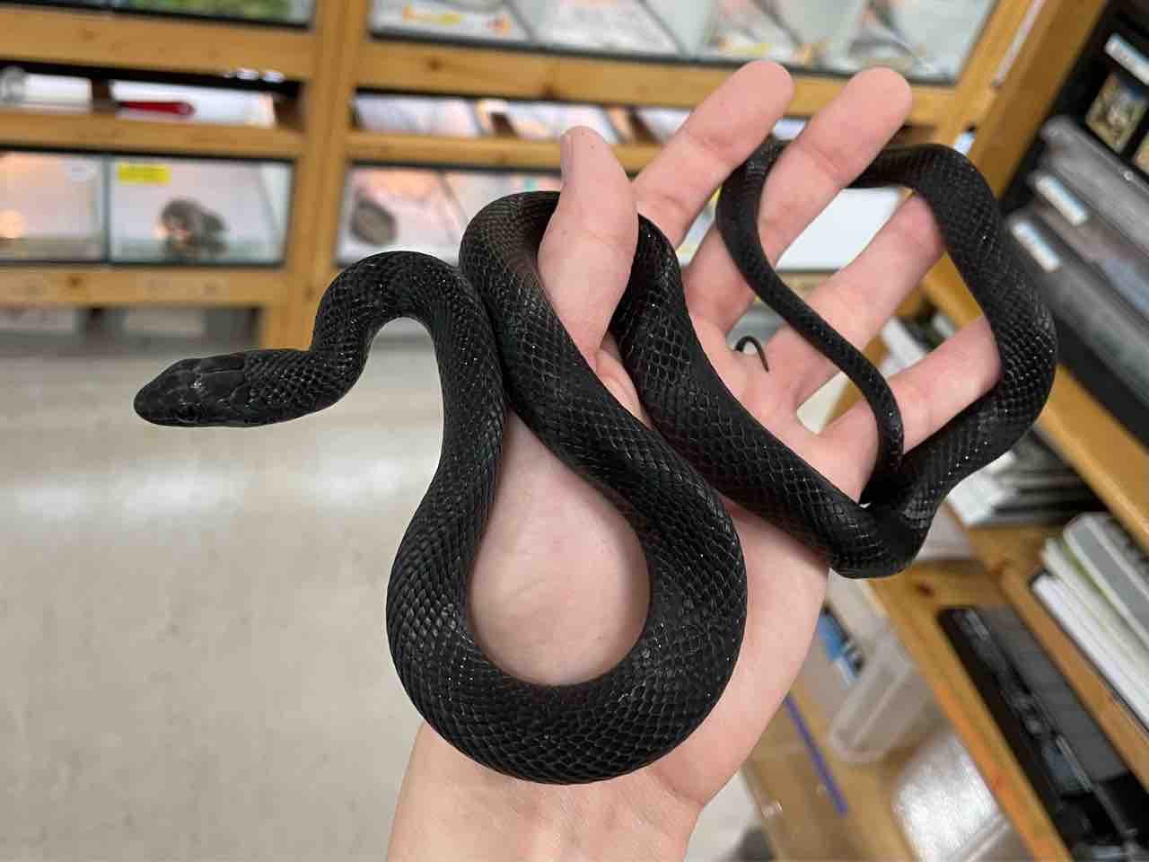 伊豆大島は特に全身が黒化した個体が多く見つかることで有名で、今回入荷した個体はその伊豆大島産の個体を原資としたCBであり、さらにその中でも極めて黒面積が多い極美カラスヘビ。