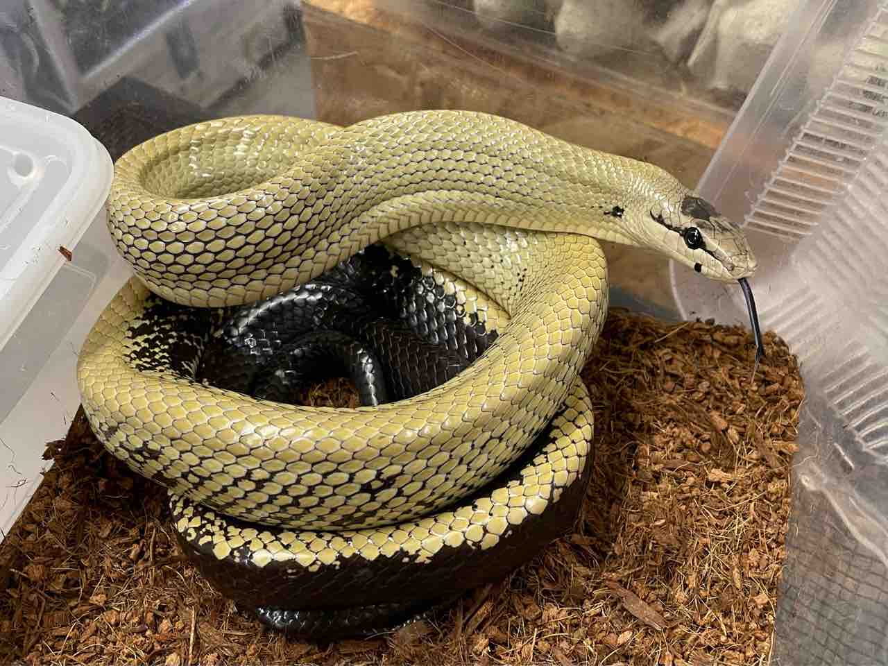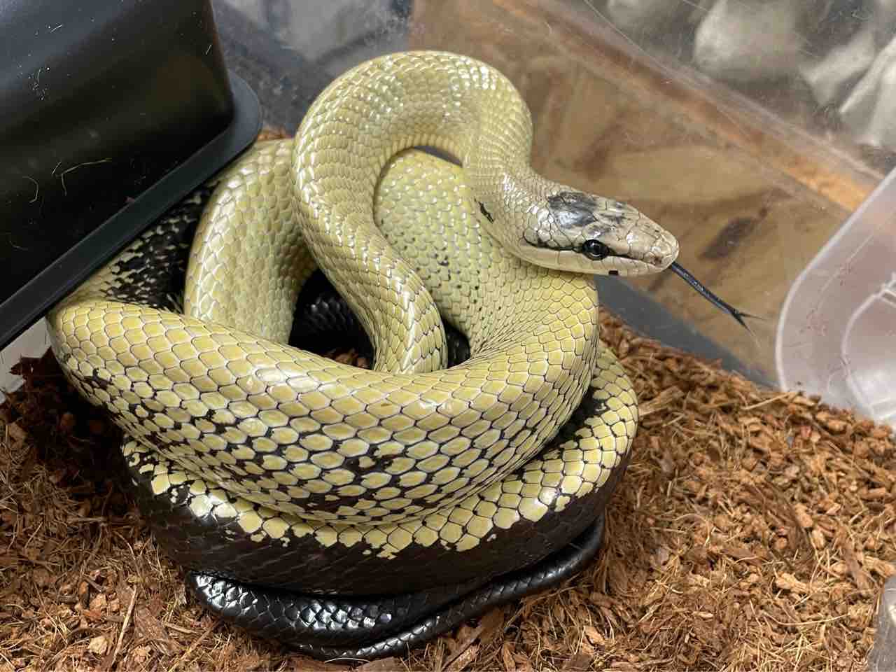 幼蛇の頃はマムシに擬態したようなカラーリングをしていますが、成長すると地色は黒化しバンドが黄色く変化してカッコイイ姿になっていきます。