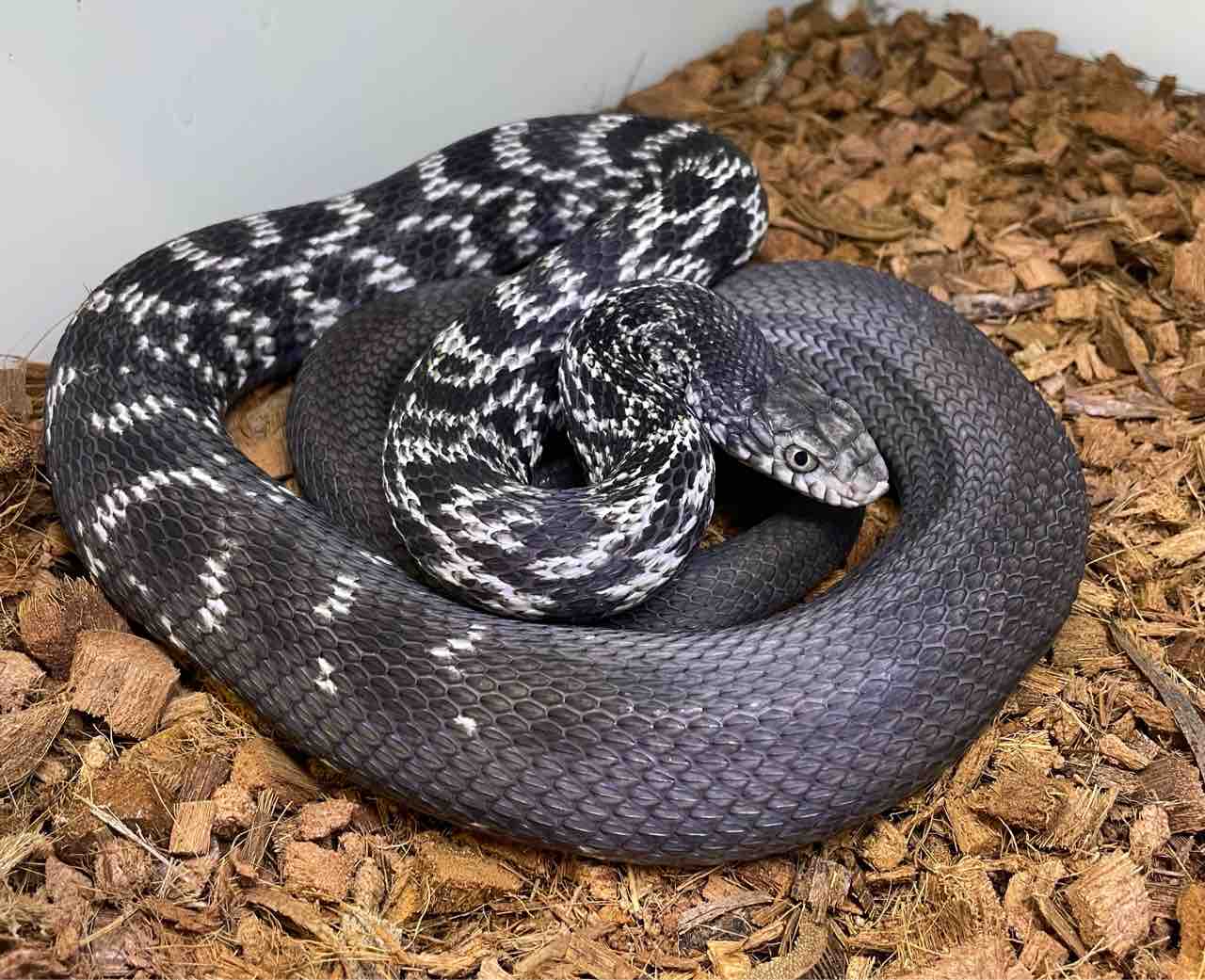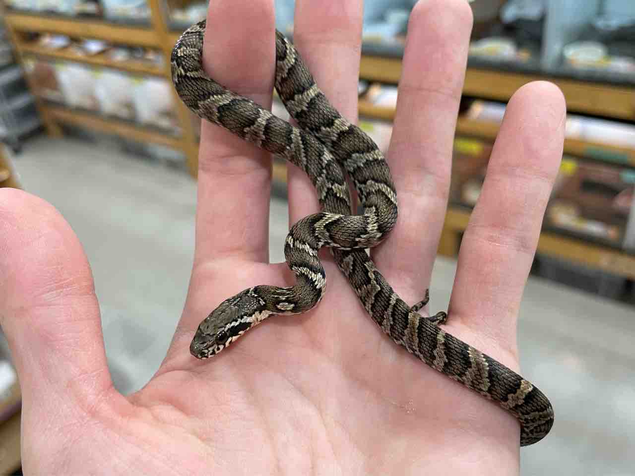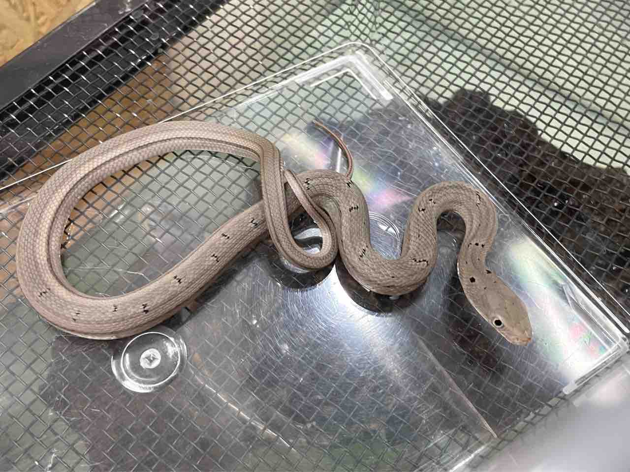 ︎︎ ♀や幼蛇は茶褐色ベースのもっと柄がはっきりとした色彩をしていますが、♂はこうして柄が薄れてグレー~オリーブ調の色彩へと変化していきます。