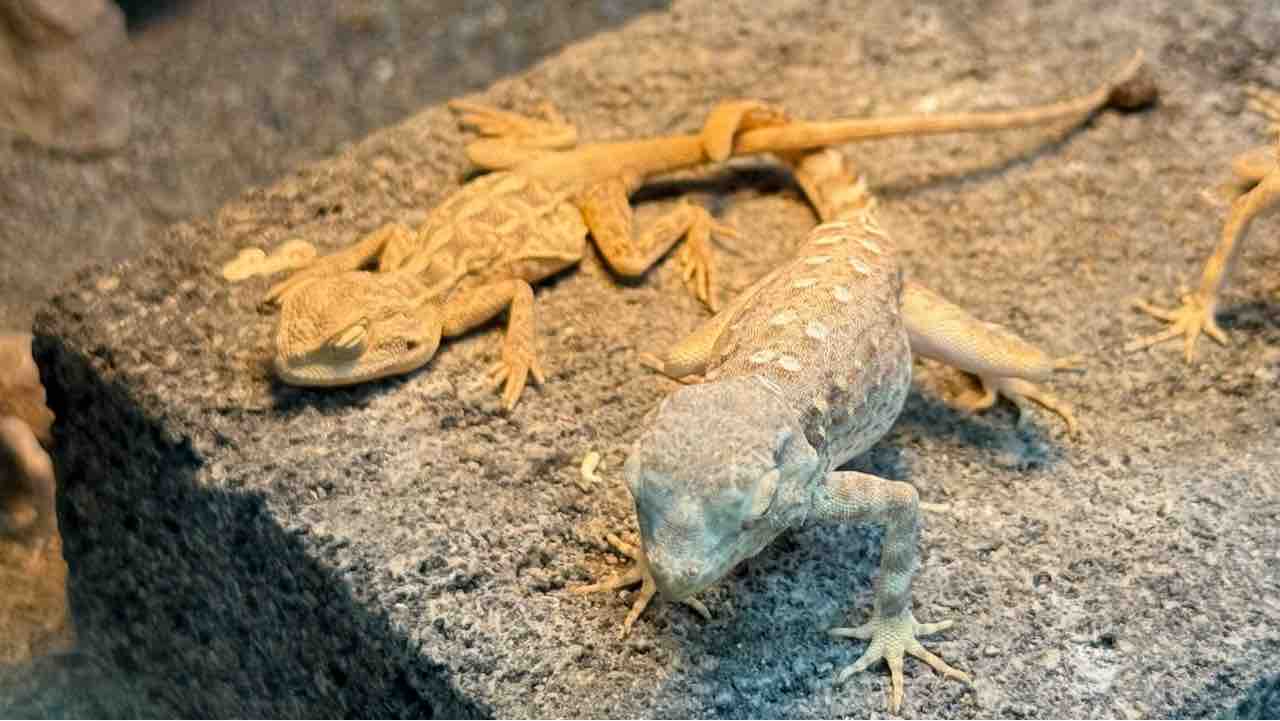 尻尾が仲良しなブリリアントグラウンドアガマのベビー(左)とカータートゲオヤモリ(右)