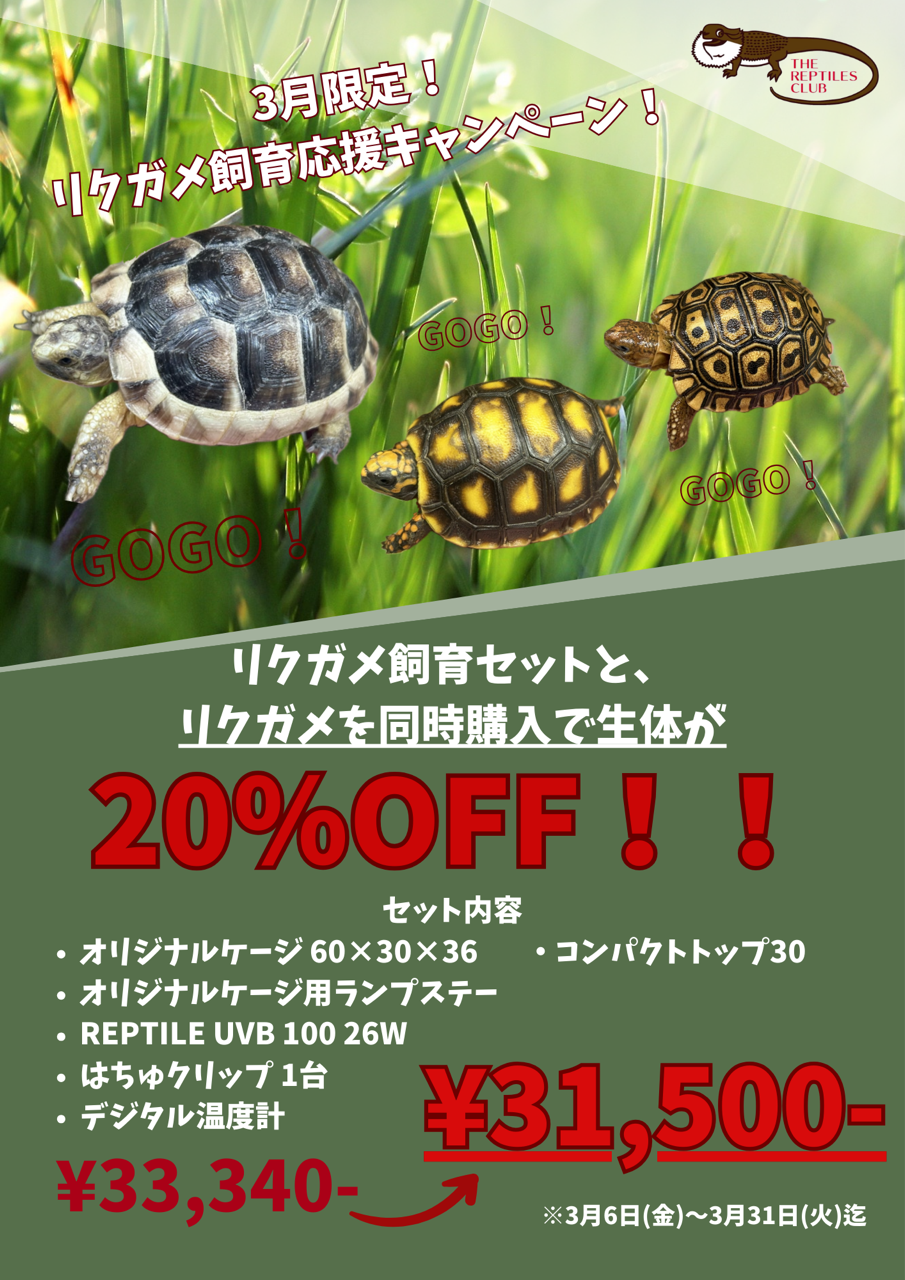 どのリクガメでも、セットと同時購入でレオパと同様生体価格が20%OFFに!!