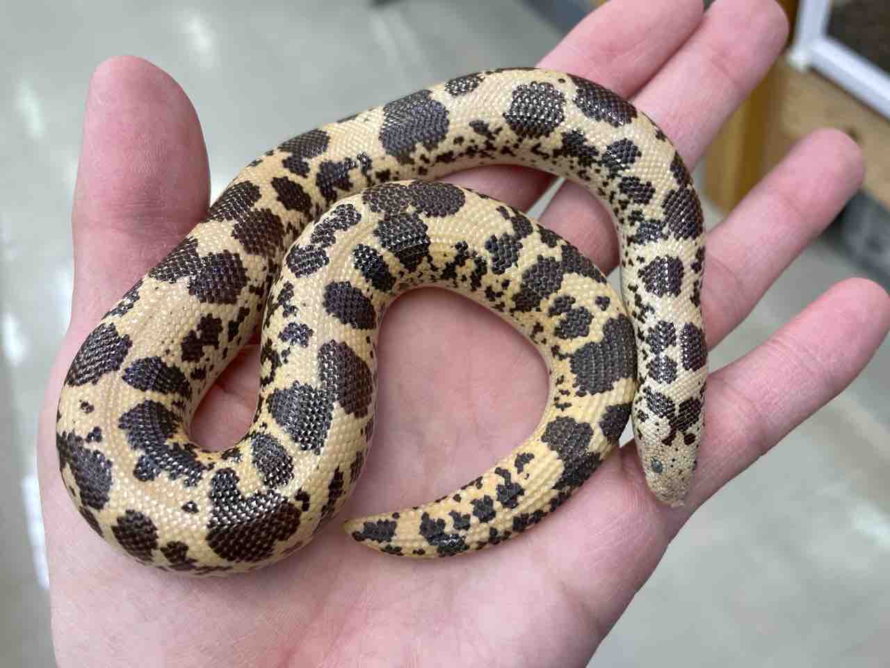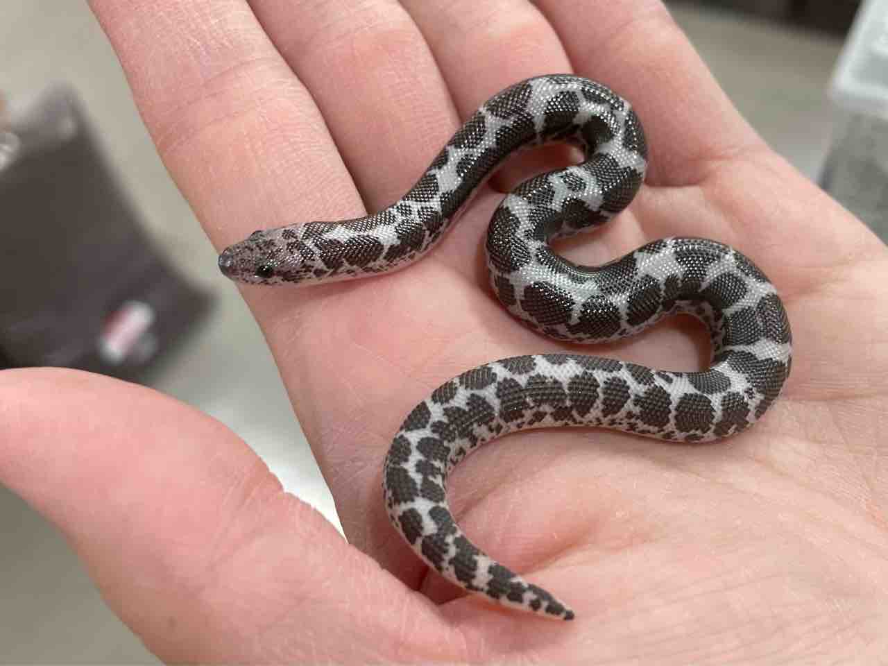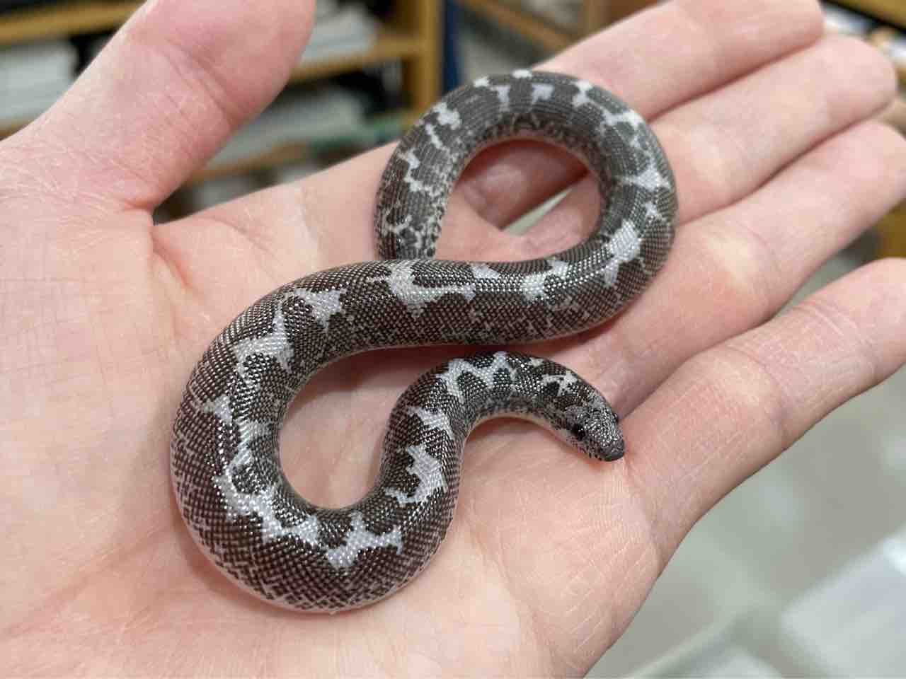 通常橙から褐色の地色に黒い斑紋が乗るケニアスナボアですが赤色色素が欠乏する‘アネリスリスティック’の作用で白黒のホルスタイン柄に。