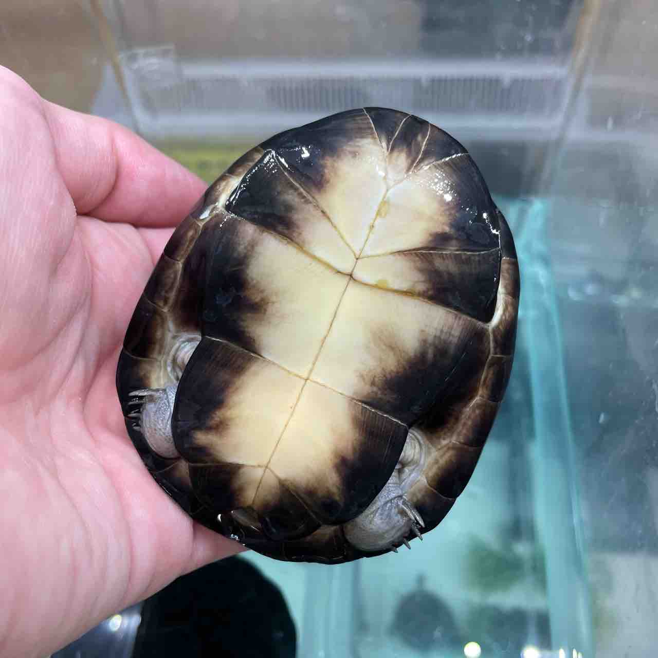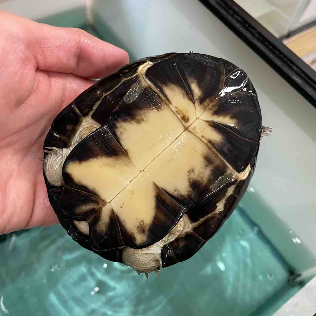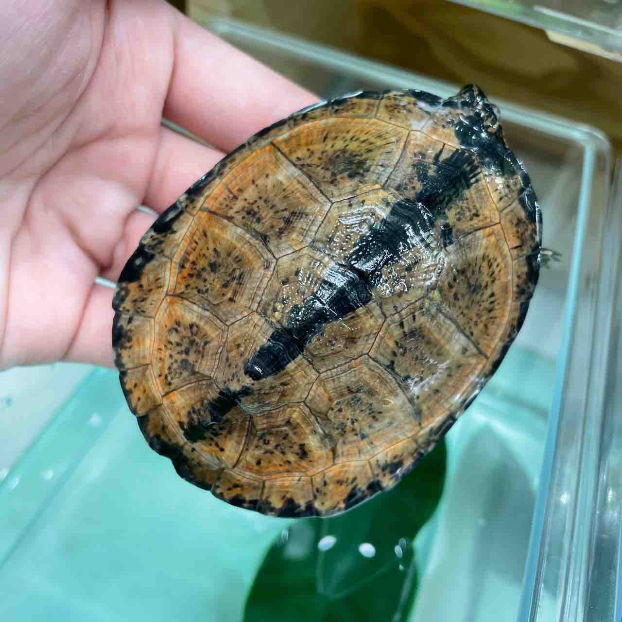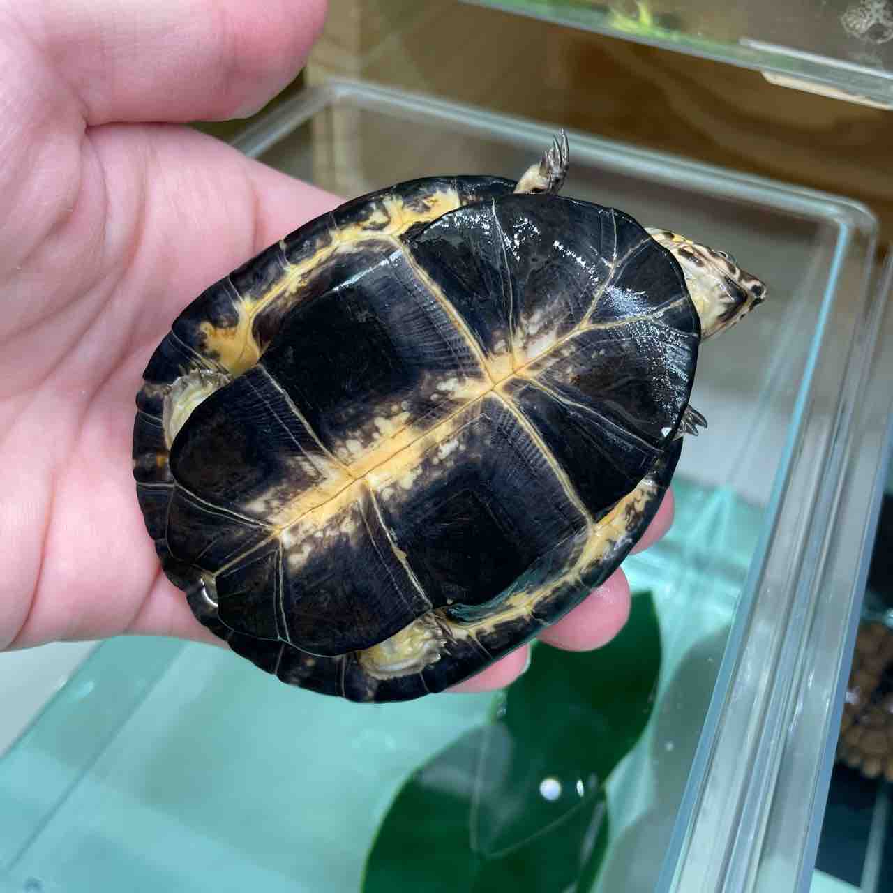 大型になるハコヨコクビガメの中でも最大サイズが小さく、頭の虫食い模様や甲羅の放射模様等、特徴が分かりやすく、人気が出るのも頷けます。