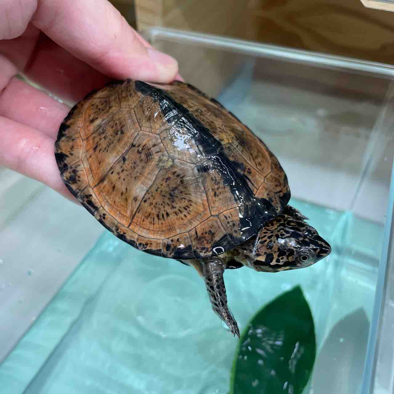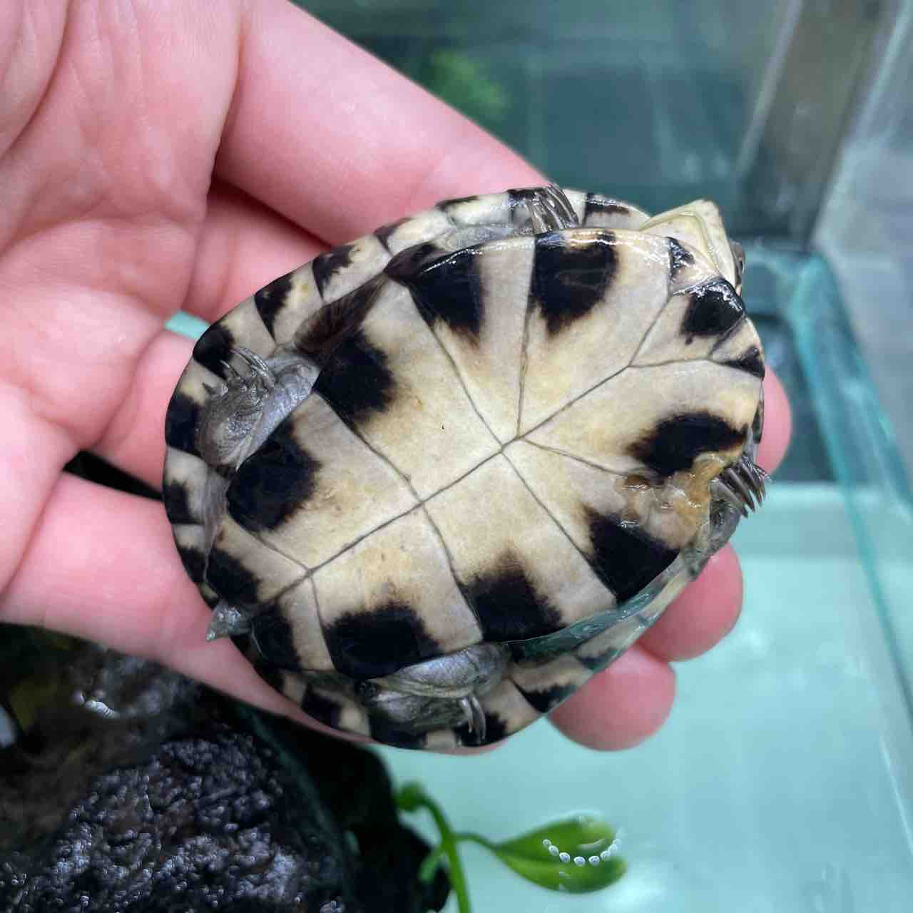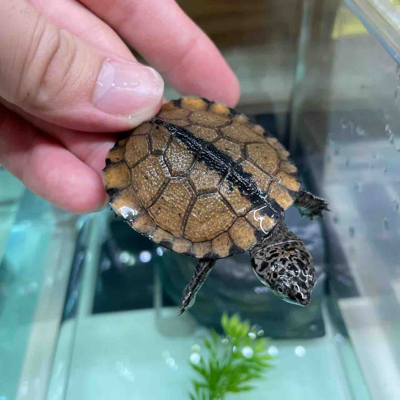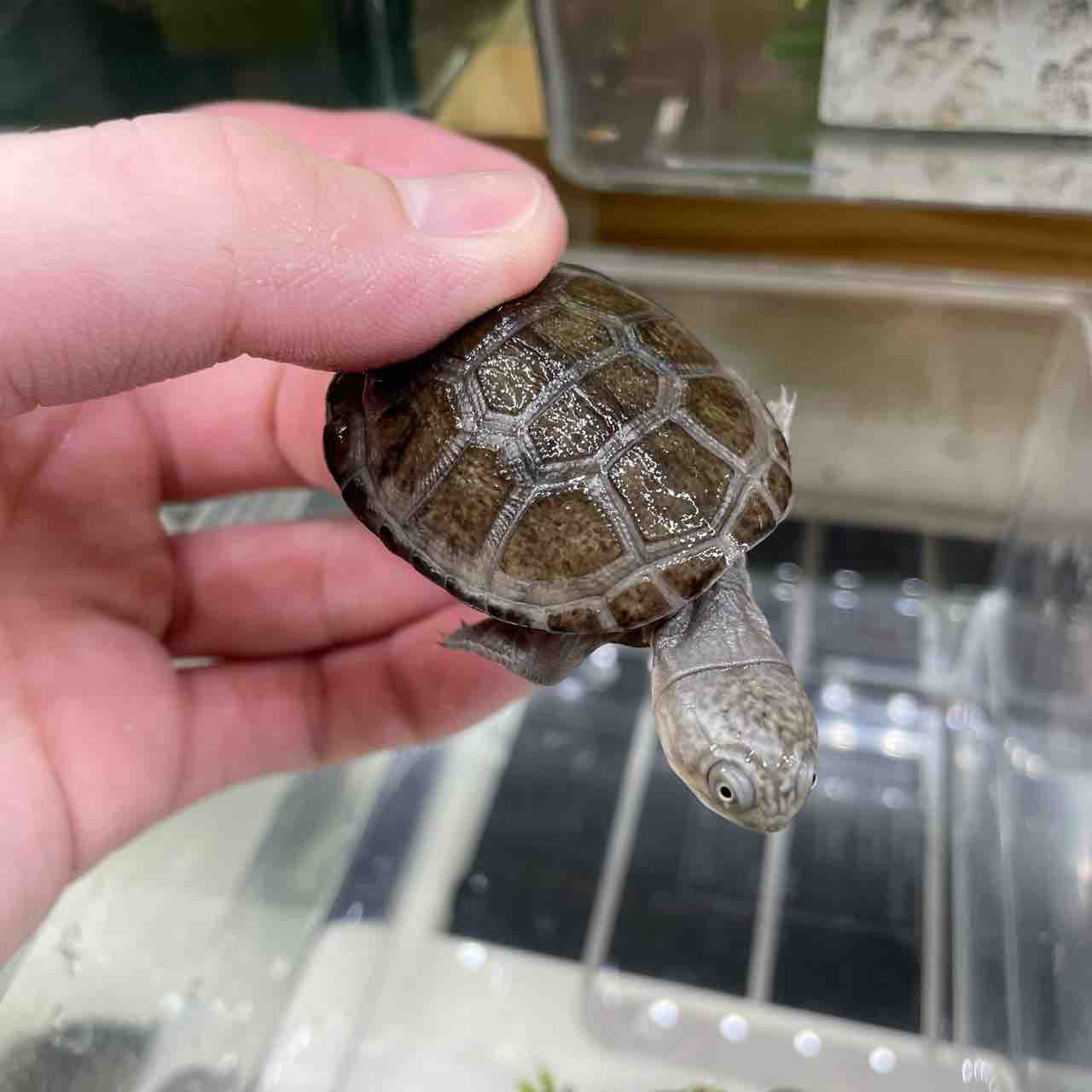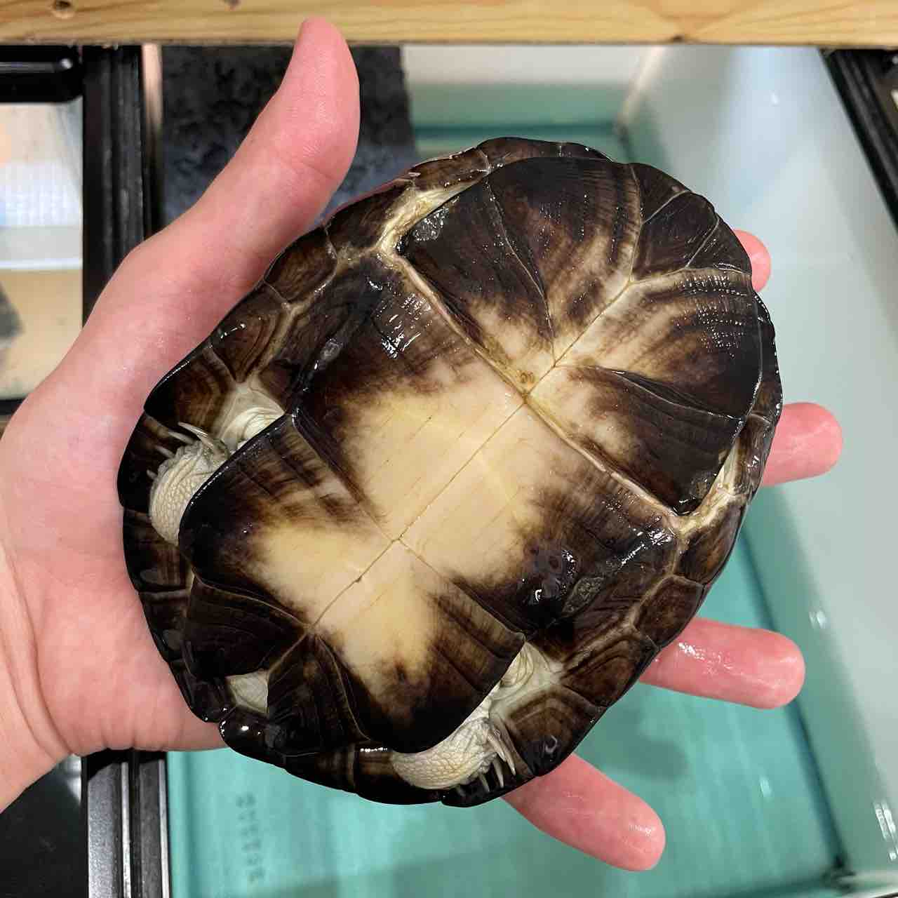 大型になるハコヨコクビガメの中でも最大サイズが小さく、頭の虫食い模様や甲羅の放射模様等、特徴が分かりやすく、人気が出るのも頷けます。