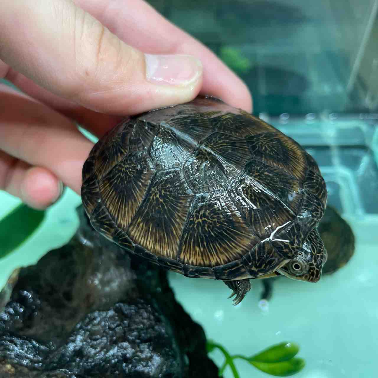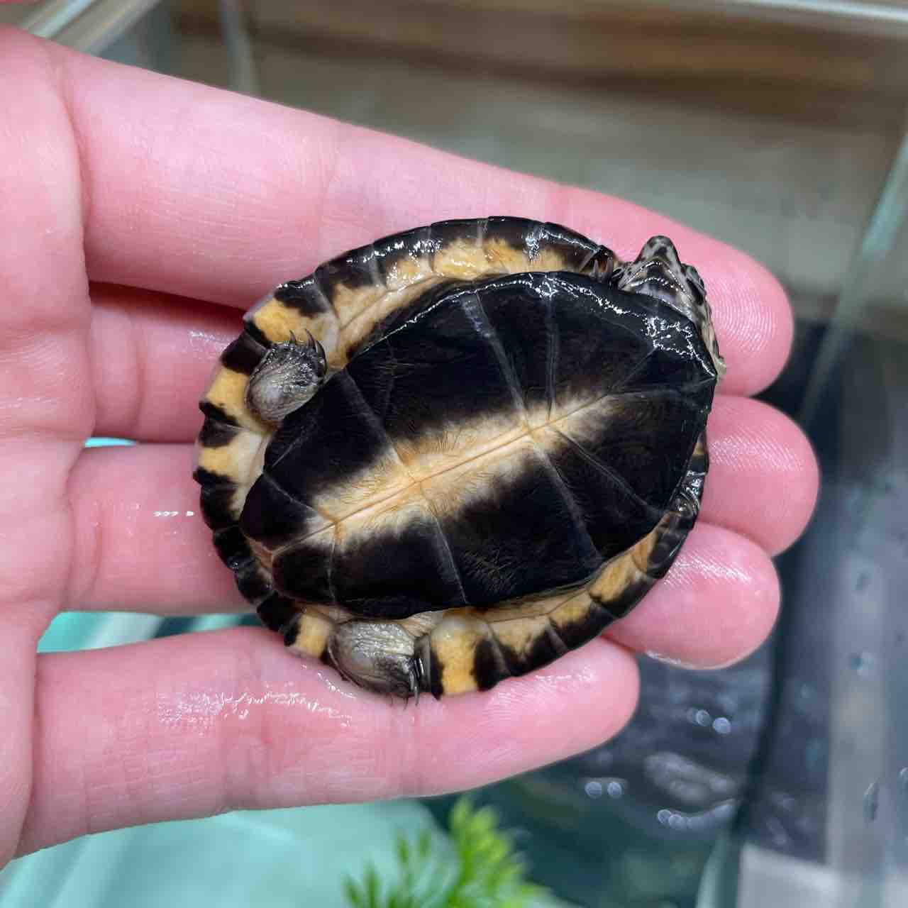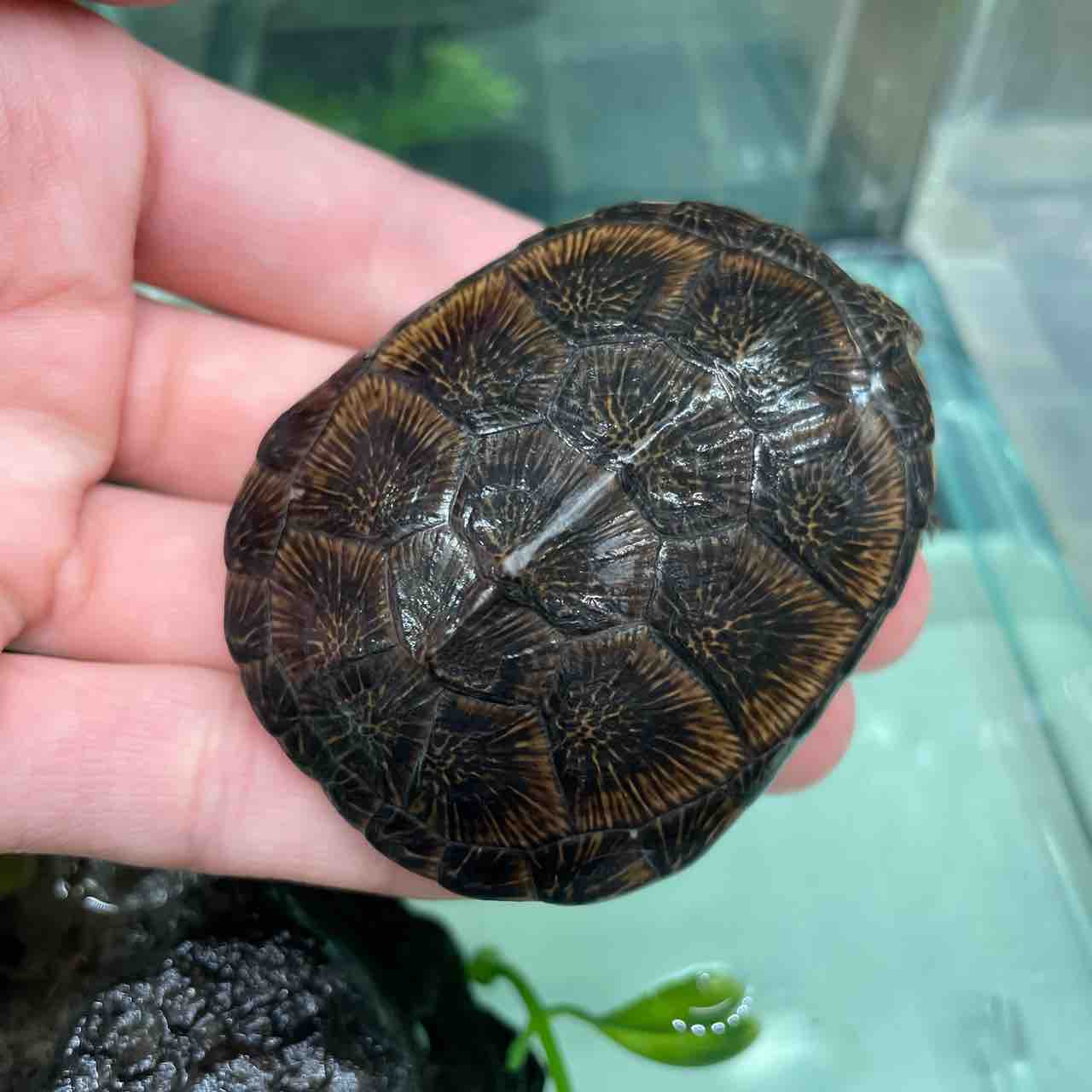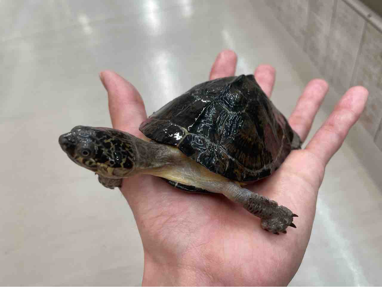 大型になるハコヨコクビガメの中でも最大サイズが小さく、頭の虫食い模様や甲羅の放射模様等、特徴が分かりやすく、人気が出るのも頷けます。