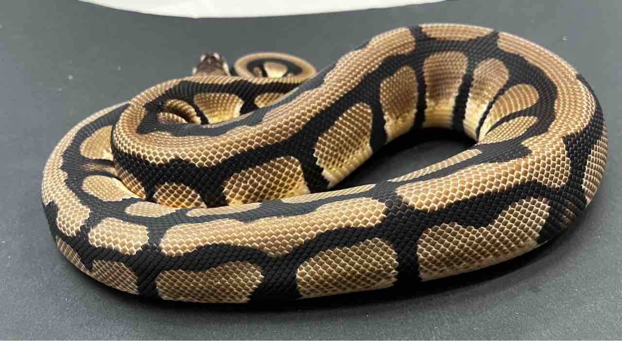 柄系のモルフと相性が良く、hetで入っているクラウンとの掛け合わせだと体側面の模様が消失しこれまた人気のモルフが完成します。